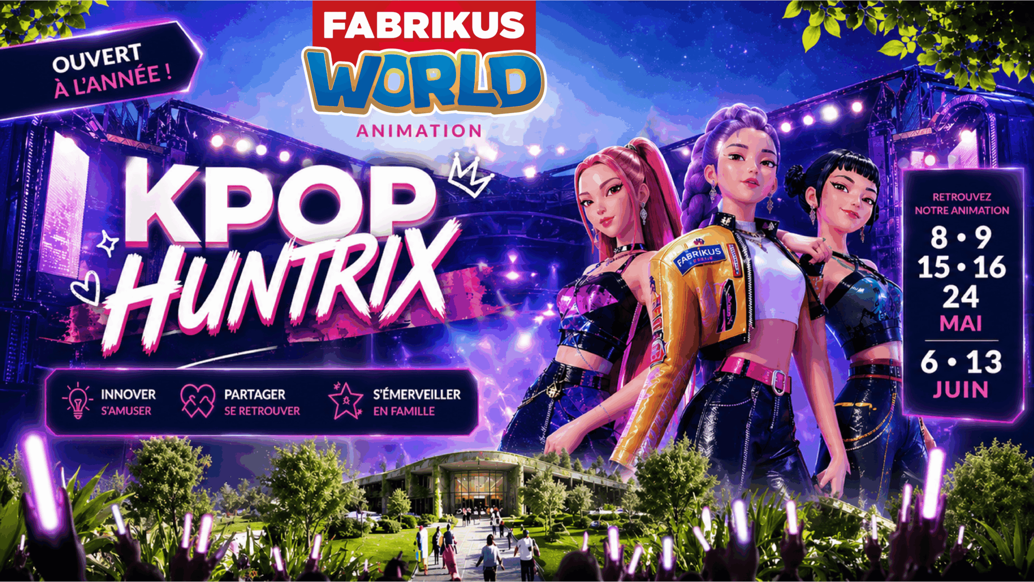 Fabrikus World accueille une toute nouvelle animation inédite inspirée de l’univers K-pop : K-POP HUNTR/X. Une expérience immersive et énergique qui promet de faire vibrer le parc au rythme de la musique et de la danse coréenne.